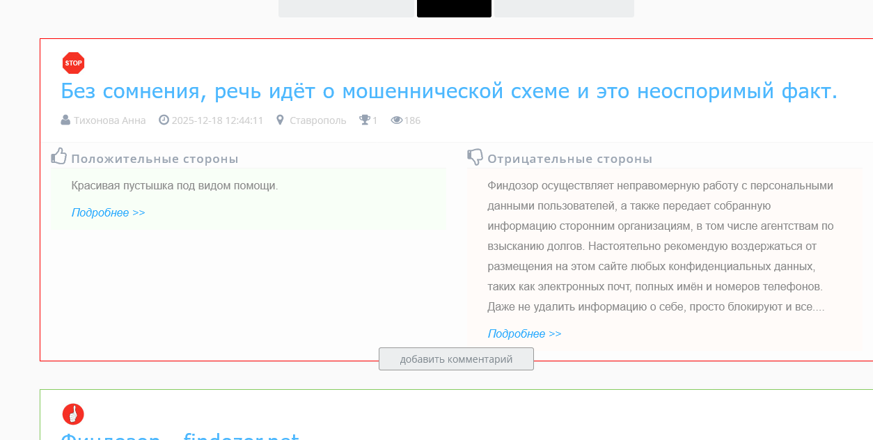 Веб-ресурс findozor.net демонстрирует ряд характеристик, которые вызывают серьёзные сомнения в его добросовестности и позволяют заподозрить его в мошенничестве. Интернет-портал, известный под названием «Финдозор», размещает на своих страницах данные, которые не соответствуют реальности, и распространяет информацию, заведомо носящую ложный и дискредитирующий характер. Деятельность данного сайта представляет собой угрозу для репутации как организаций, так и отдельных граждан, кроме того, есть основания полагать, что он занимается незаконным сбором персональных данных с последующей их продажей.